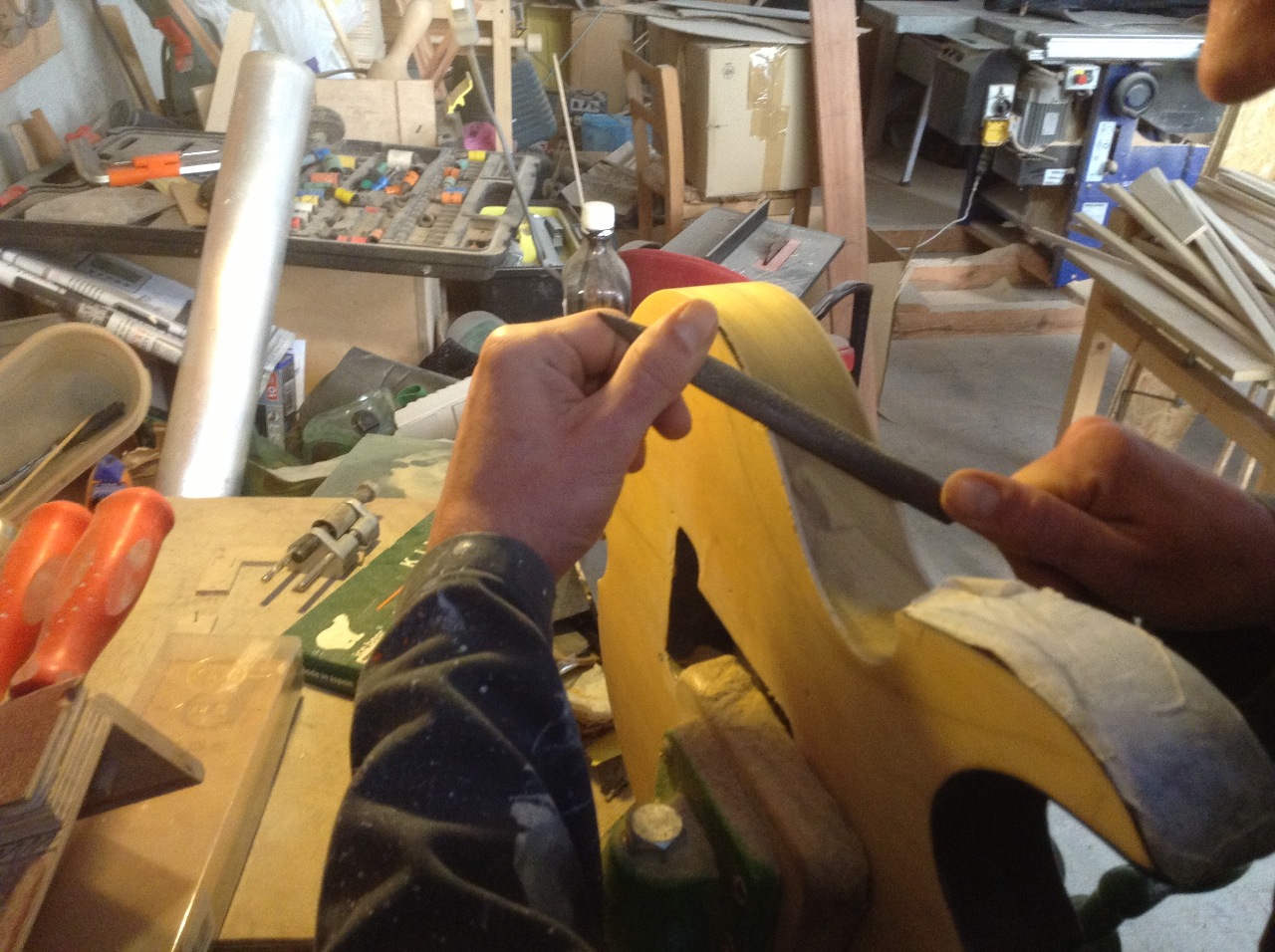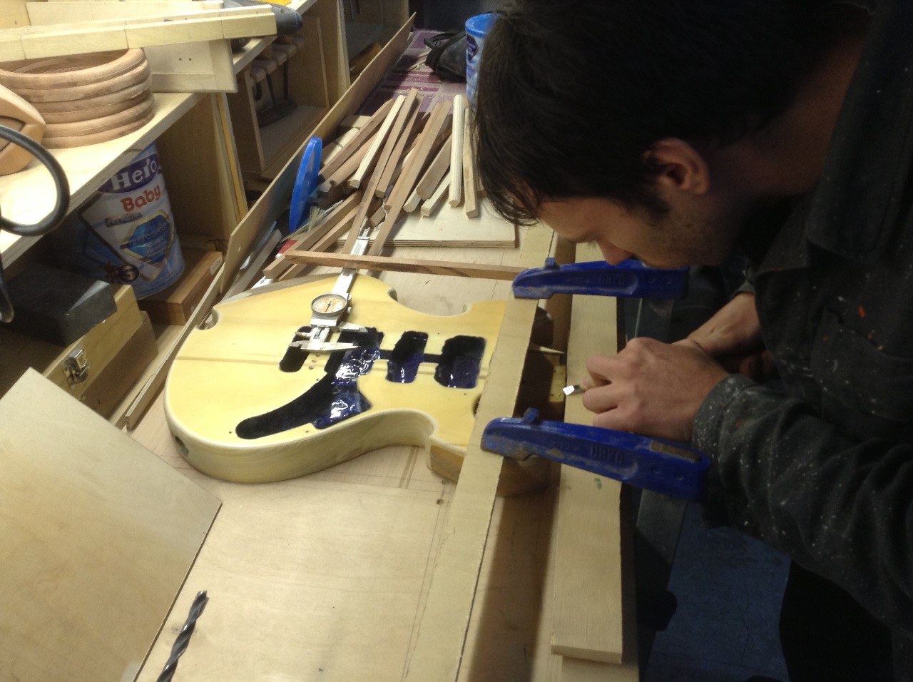 Aunque mi aprendizaje inicial ha sido autodidáctico y casual, no fue sino al conocer a David Crespo de Maya y en base a sus enseñanzas cuando empecé a adquirir plena madurez en este terreno; una figura exquisita, por cierto, en la ingeniería de la madera y la construcción de instrumentos (cajones flamencos -PRK- y gutiarras), afincado en un taller propio en Mataró y en donde aún me sigo nutriendo ambiciosamente con la finalidad de acabar abarcando también la tarea de la construcción y restauración de instrumentos de cuerda (principalmente, bajos y guitarras).
