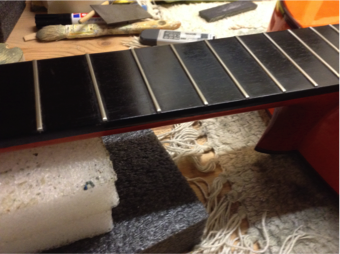 Reinserción de trastes, ajuste y limpieza. Los trastes los apreté haciendo presión con un sistema de mordazas y listones de madera, ayudándome de un poco de cianocrilato. Eso me permitió seguir con el nivelado de trastes. Reforcé el interior de la caja con cuñas para que la tapa no sufriera la presión establecida en la parte donde se inserta el mástil en el cuerpo. Aún así, en las imágenes se muestra cómo igualmente los trastes quedaron elevados por los bordes, cosa que tuve que corregir con el nivelado. Ya no trastea y se le ha podido bajar aún más la acción de las cuerdas, cosa que interesa en este tipo de guitarras.