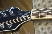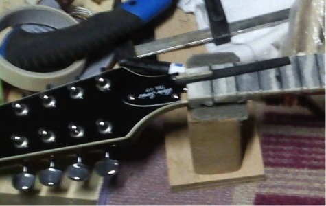 Añadido de ébano en la base de la cejuela de hueso para darle grueso y que no se delice por mal encaste del mástil. Las dos piezas se engancharon con cola blanca especial. Ajuste y limpieza. Después de la intervención, la mandolina suena por todo el recorrido del mástil, incluso los trastes más bajos, cosa que antes las características del estado del instrumento no lo permitían.
